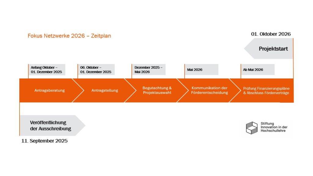 Bitte beachten Sie die Erreichbarkeit der Stiftung in dringenden Fragen vor Fristende: Die zuständigen Kolleginnen sind am 28.11.25 bis 15:00 Uhr und dann wieder ab dem 01.12.25 ab 09:00 Uhr per E-Mail an fokus@stiftung-hochschullehre.de zu erreichen.